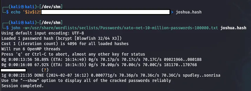 Le fichier contient un hash pour l’utilisateur Joshua commençant par “$2a$“, ce qui indique probablement un algorithme bcrypt.