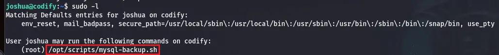 Très bien, nous pouvons désormais nous connecter à la machine via SSH en tant que joshua et essayer la commande sudo -l, puisque nous disposons du mot de passe correspondant. Le résultat nous indique que nous ne pouvons exécuter qu’une seule commande en utilisant les privilèges sudo :