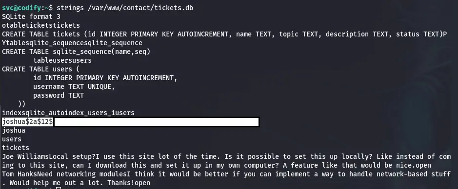 Cet utilisateur pourrait être notre utilisateur permettant un mouvement latéral, alors gardons cette information à l’esprit pendant que nous explorons le système. Dans le dossier /var/www/contact/, nous trouvons un fichier de base de données nommé tickets.db.
