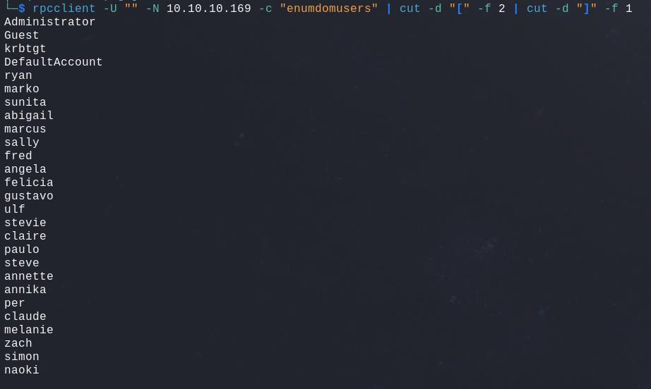 L’étape suivante sera le RPC. Il est parfois possible de s’y connecter sans authentification et, ici, c’est effectivement le cas. De cette façon, nous pouvons extraire de nombreuses informations telles que les utilisateurs, les groupes et bien plus encore, commençons par créer une liste d’utilisateurs :