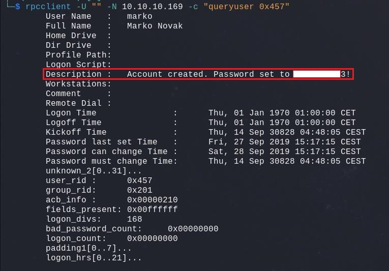 Nous pouvons répéter cette opération pour énumérer le nom de domaine, les groupes et bien plus encore, par exemple pour obtenir des informations plus détaillées sur un utilisateur spécifique. Ce faisant, nous tombons sur un mot de passe lié à l’utilisateur nommé Marko :