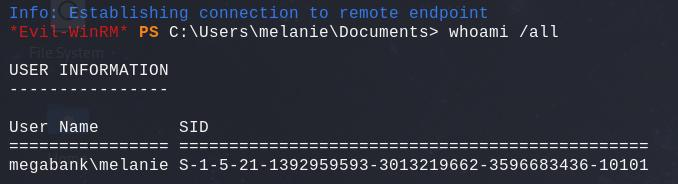 Il semble que Melanie utilise toujours le mot de passe par défaut. D’après l’énumération précédente, nous savons qu’elle fait partie du groupe Remote Management Users et qu’elle dispose d’un accès WinRM. Nous pouvons donc utiliser ses identifiants pour obtenir un accès initial à la machine.