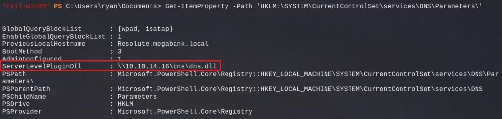 En tant que membre du groupe « DNS Admins », nous avons accès au service DNS, ce qui signifie que nous pouvons tenter d’en abuser en injectant une DLL dans le service lors de son démarrage. Pour ce faire, nous devons ajouter une clé de registre indiquant à notre DNS de rechercher notre DLL. Le service va démarrer en utilisant les droits « NT AUTHORITYSYSTEM » et nous en tirons parti pour exécuter notre propre code via la DLL et, dans ce cas, modifier le mot de passe administrateur.